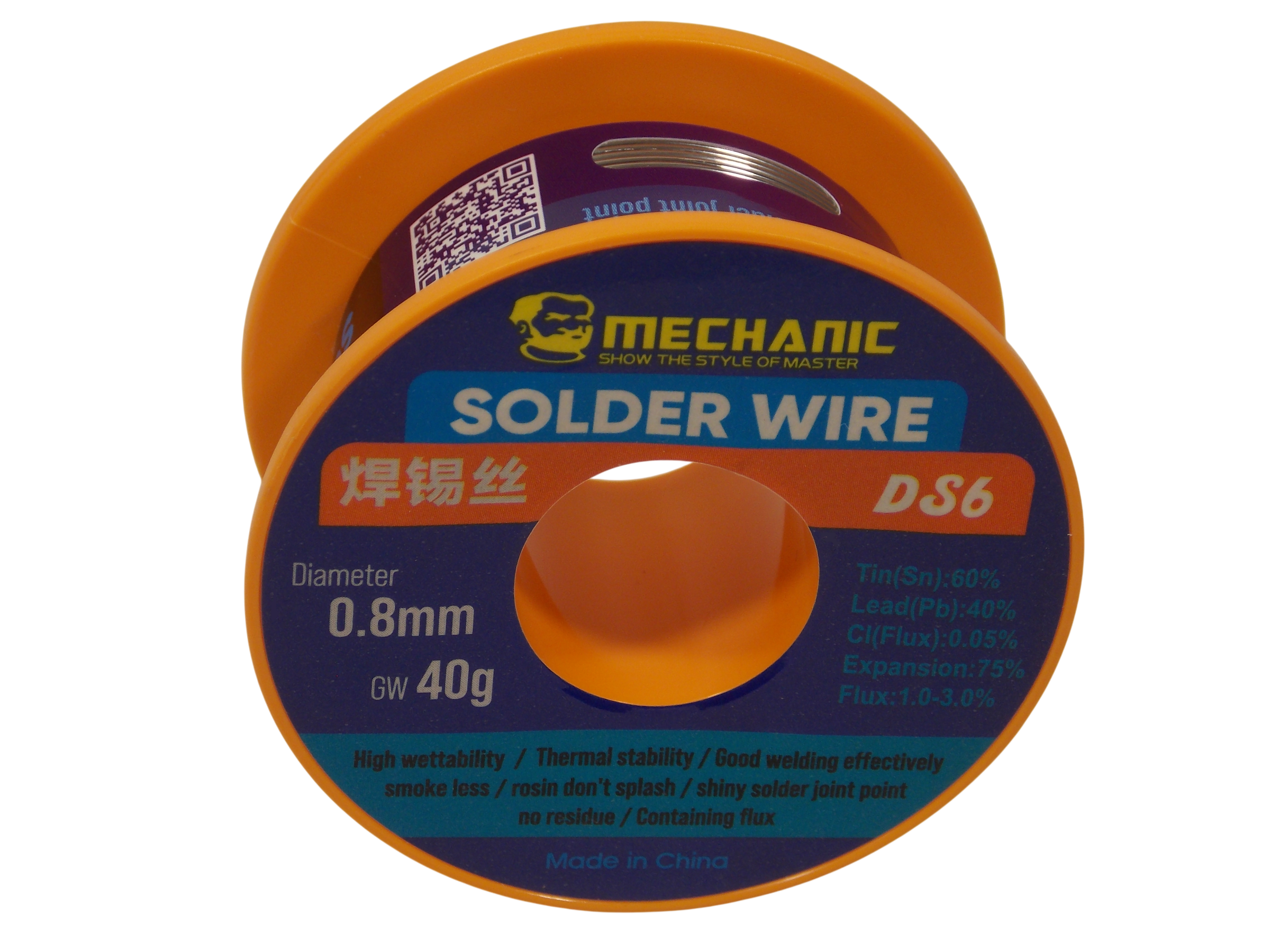 Припой Mechanic DS6 диаметром 0.8 мм - это качественный проволочный оловянно - свинцовый припой ( Sn60/PB40), с добавлением канифольного флюса до 3%.